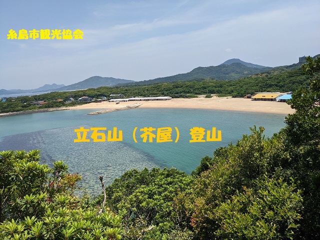 白砂ビーチの糸島市芥屋海水浴場から登る『立石山』。標高210mながらも海抜0mからの登山なので、しっかり登山が楽しめます。登山口から約40分で頂上へ。途中の展望所経由でも50分で登り切れます。3合目以上は木々が無く、岩場となりますが、海水浴場から幣の浜に続く海岸線を一望!!まさに絶景です!!。頂上からは西側の姫島方面が望めます。