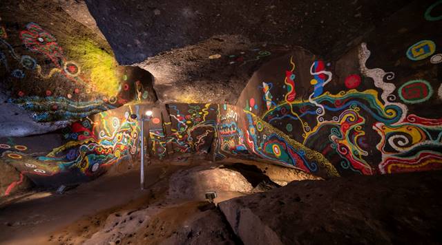 今回のフォトドラは、霧島市。天孫降臨のさまざまな神話が残る場所で、伝説を巡るドライブがおすすめ!そんな霧島市へ、フォトドラナビゲーターの津代さんと角囿リポーターが「GR86」で向かいます。「今回は、山の中の神秘的な空間ですよ!」という津代さんに連れられてやってきたのは、熊襲の穴。南九州を治めていたクマソ族の首領が住んでいたとされる洞窟です。女装して潜入したヤマトタケルに成敗されたという神話が残ります。中には、芸術家・萩原貞行氏のモダンアートが描かれ、神秘的な空間を作り上げています。