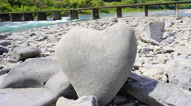 何度倒れても、起き上がる⁉ 半家沈下橋付近の河原には、ハートの形の石が立てられています。四万十川の恋の石、みなさんも見つけてみるといいことがあるかも。