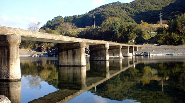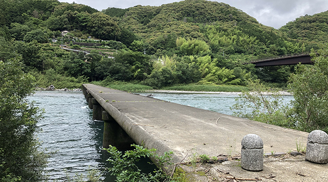 JRの鉄橋と抜水橋(半家大橋)、沈下橋という3つの橋が並行に架かる珍しい風景。フォトスポットとしても人気です。