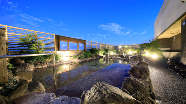 絶景露天風呂は標高約100mの緑のパノラマと、昼夜で表情を変える都心ビル群を一望できる唯一無二の眺望が広がります。深度1750mから湧き出す天然温泉は、黒色の「美人の湯」「美肌の湯」とも言われる弱アルカリ性の炭酸水素塩泉です。サウナ室は、熱したサウナストーンに自動で水を噴射し、発生した蒸気を送風機で室内全体に送るオートロウリュ。マイナスイオンを含んだ蒸気が室内に充満し、体感温度が一気にあがり、発汗を促進します。